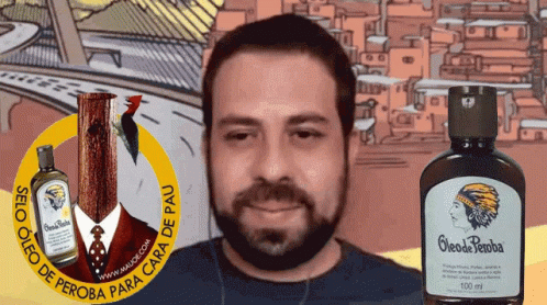 Boulos smiling with 'Óleo de Peroba' product and 'Cara de Pau' logo in the background.