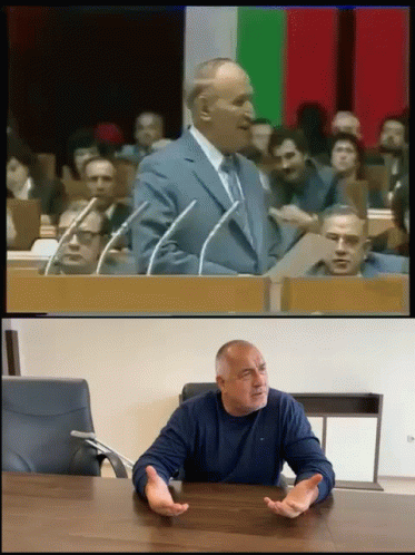 A split-screen video comparing Boyko Borisov speaking at a desk with Todor Zhivkov giving a speech.