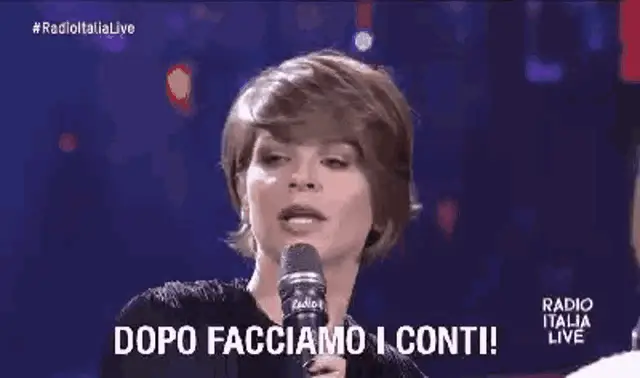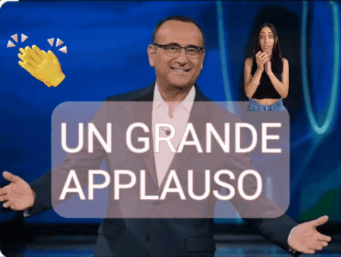 Carlo Conti presents a big applause for an artist from Casa Bradford, with a woman reacting excitedly.