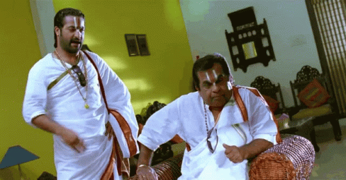 Brahmanandam and Jr NTR in a scene from the movie Adhurs, discussing success and happiness.