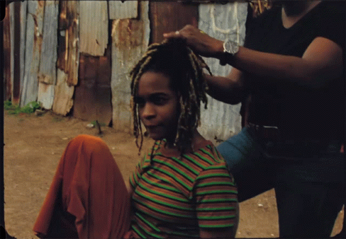 Jamaican reggae artist Koffee (Mikayla Simpson) getting her dreadlocks styled by a man in an outdoor setting.