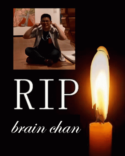 A memorial image for Brain Chan, featuring a man sitting on the floor and a lit candle with 'RIP brain chan' text.