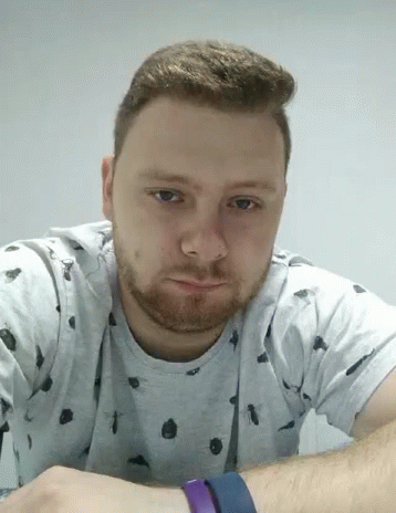 A man with a beard, wearing a patterned grey shirt, looks tired and rests his head on a surface.