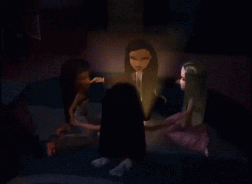 Bratz dolls gather in a dark room, holding hands in a circle for a seance or manifesting ritual.