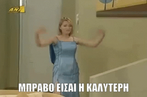 A woman from Konstantinou Kai Elenis joyfully exclaims 'Bravo, you are the best!' with arms outstretched.