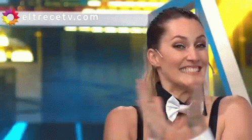 Mica Viciconte smiles and claps, celebrating in front of an El Trece banner, showing her excitement.
