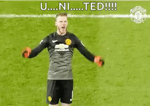 Goalkeeper David De Gea celebrates on the field with arms raised, as the crowd chants 'UNITED!'