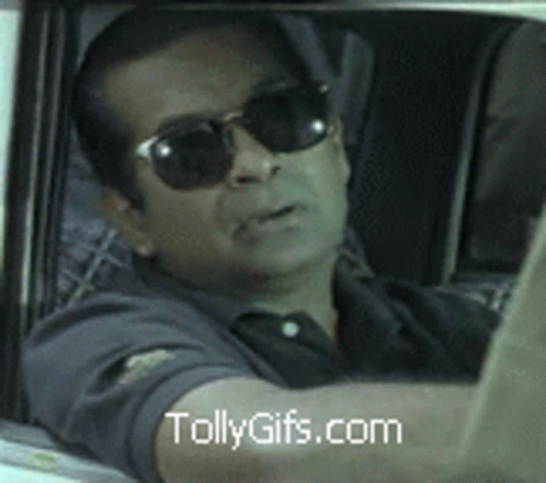 Brahmanandam delivers his iconic dialogue 'Do you know who you are talking to?' from a car, wearing sunglasses.