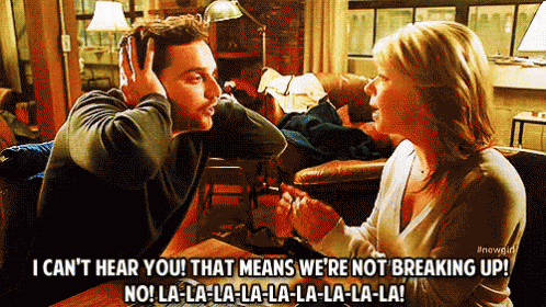 A man comically refuses to hear about a breakup, covering his ears and yelling 'I can't hear you!'