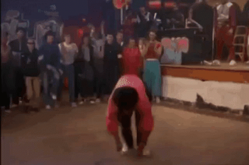 A breakdancer in a pink top performs dynamic moves, including a handstand spin, for a cheering crowd.