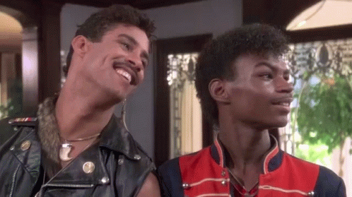 Shabba Doo and Boogaloo Shrimp share a hearty laugh, one wearing a leather jacket, from the movie Breakin' 2.