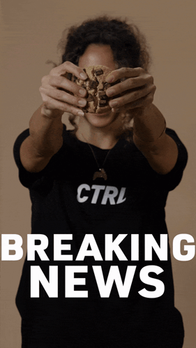 A woman in a CTRL shirt presents a 'breaking news' reveal of a delicious protein cookie.