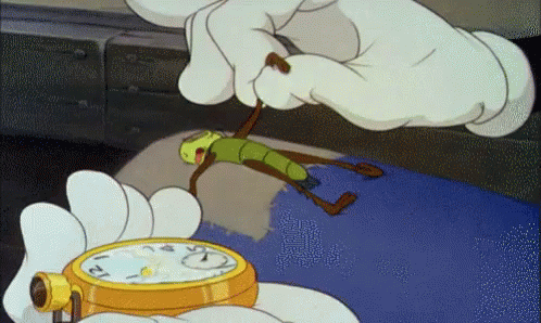 A cartoon character, Little Grasshopper, is held by a gloved hand next to a pocket watch.