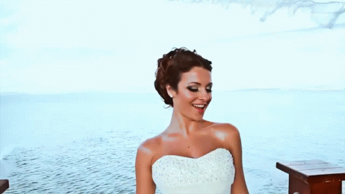 A beautiful bride in a white wedding dress smiles and dances joyfully by the ocean on her special day.