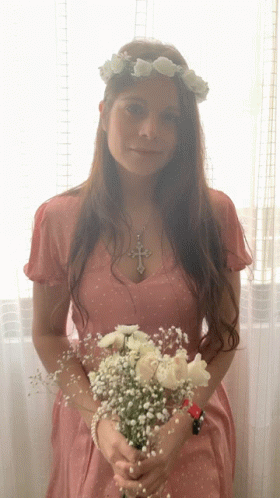 Mary Avina, a bridesmaid in a pink dress, smiles while holding a bouquet of white flowers and wearing a flower crown.