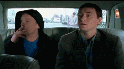 Sasha Belyj and Pciola from Brigada sitting in the back seat of a car, looking around.