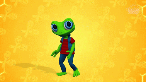 The frog character from El Reino Infantil dances and jumps happily on a bright yellow background, showcasing joyful movements.