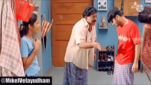 An older man, possibly Mohan or Admanoj, angrily confronts a younger man in a red shirt in a scene from Brindavan Colony.