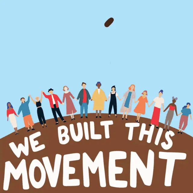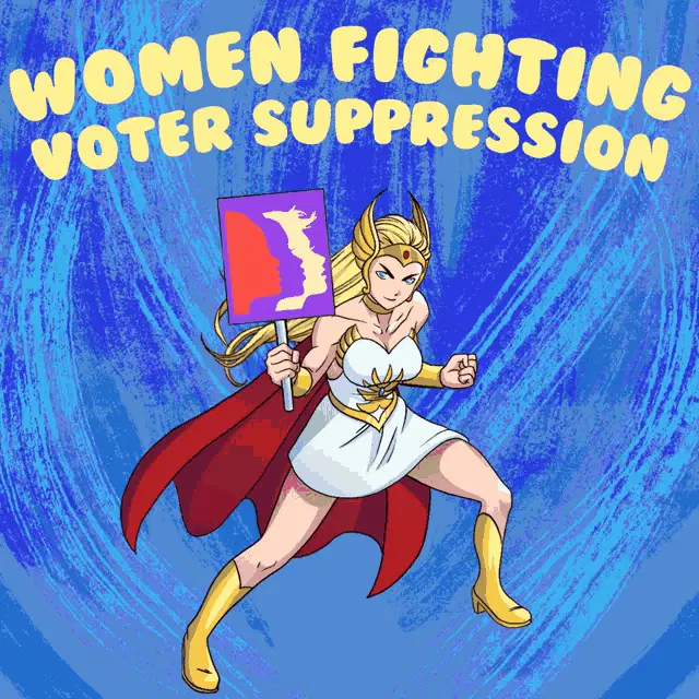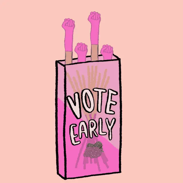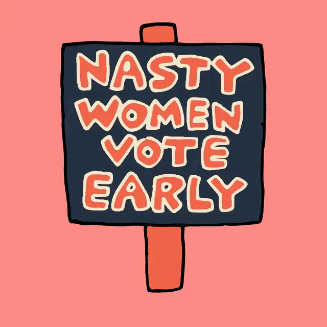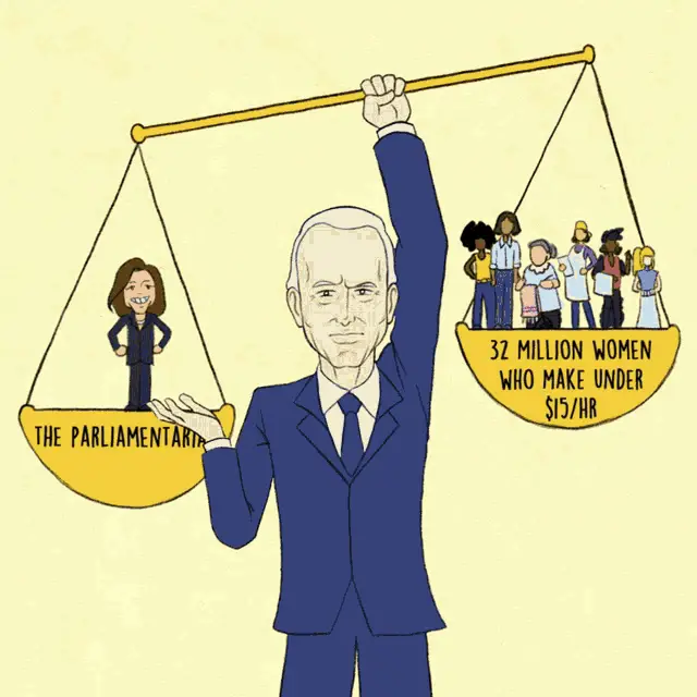 Illustration of a hand holding a bouquet of flowers with messages: Bring Back Jobs For Women, Affordable Child Care, $15 Minimum Wage.