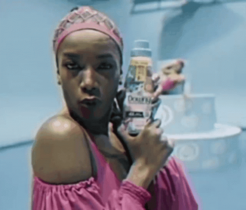 Brisa Iza in a pink dress, smiling and holding a Downy bottle, appearing to dance.
