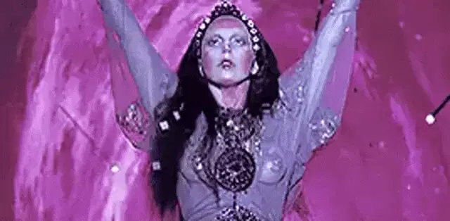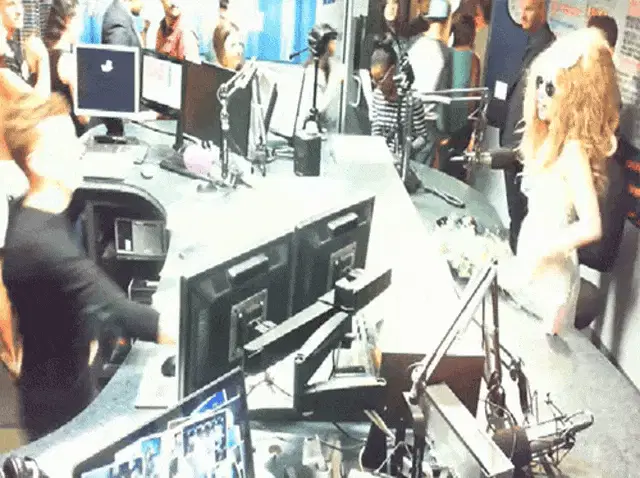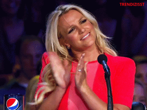 Britney Spears claps enthusiastically while seated, wearing a vibrant red dress, with a Pepsi cup visible nearby.