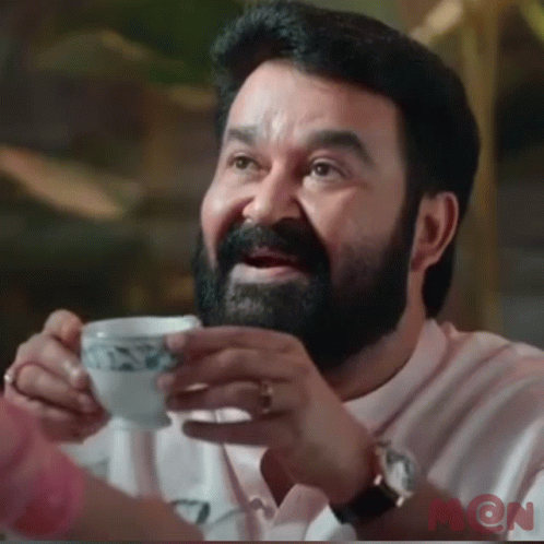 Mohanlal from Bro Daddy Movie reacts with a smile and a grimace while holding a cup.