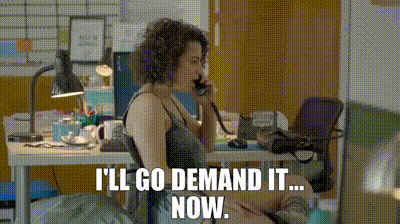 a woman is sitting at a desk talking on a phone and the words `` i 'll go demand it now ''