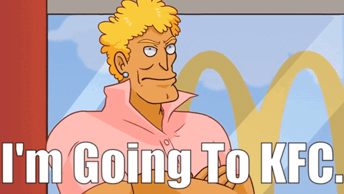 Brody Foxx animated character declares 'I'm Going To KFC' in this popular meme, with a McDonald's in background.