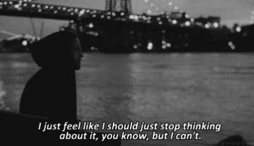 A person sits alone by the water at night, feeling broken and tired, unable to stop thinking about something.