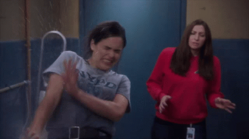 Amy Santiago (Melissa Fumero) from Brooklyn Nine Nine gets unexpectedly sprayed by water from a broken pipe.