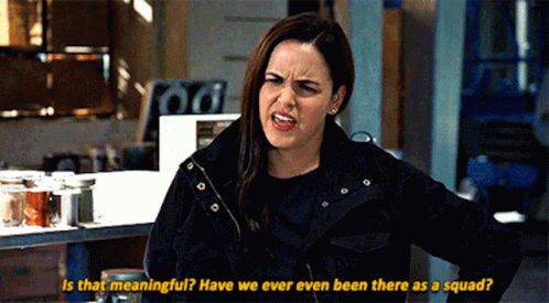 Amy Santiago (Melissa Fumero) from Brooklyn Nine-Nine questions the meaning of 'squad' with a skeptical look.