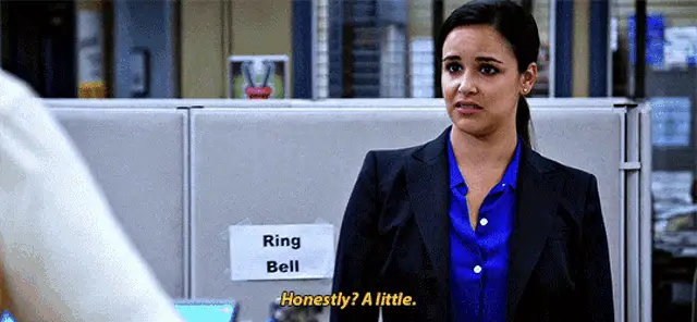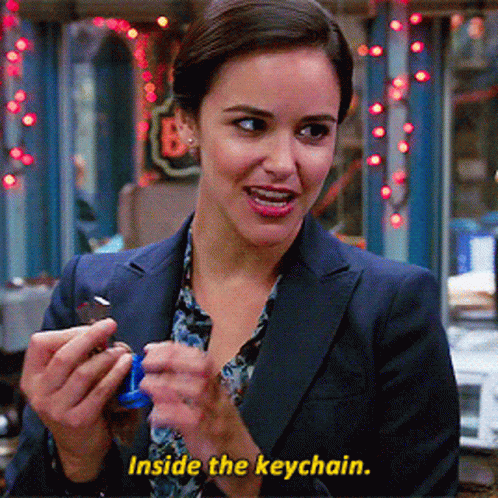 Amy Santiago from Brooklyn Nine-Nine reveals something 'inside the keychain' with a playful expression.
