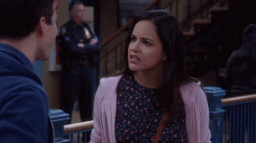 Amy Santiago from Brooklyn Nine-Nine gives a confused look while wearing a pink cardigan.