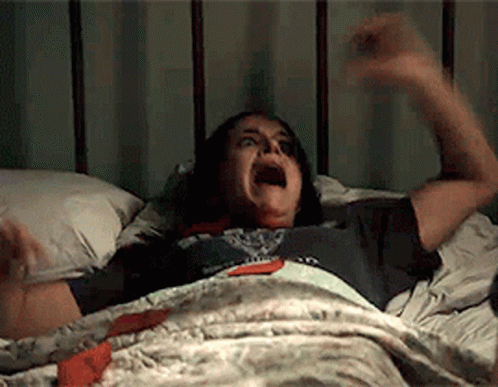 a woman is laying in a bed with her mouth open .
