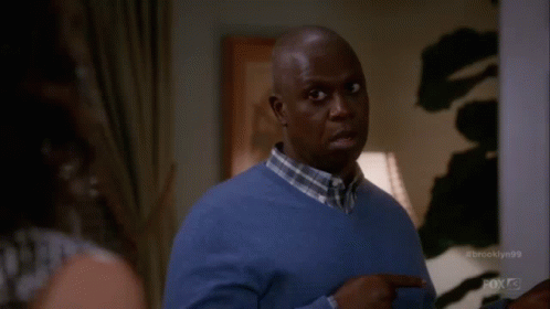 Captain Raymond Holt (Andre Braugher) reacts with a shocked 'OH' then 'NO' expression.