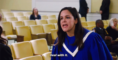 Amy Santiago (Melissa Fumero) in a blue gown defiantly says 'Deal with it' in an auditorium scene from Brooklyn Nine-Nine.