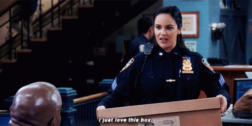 Amy Santiago (Melissa Fumero) from Brooklyn Nine-Nine enthusiastically declares her love for a box.