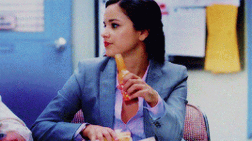 Amy Santiago from Brooklyn Nine-Nine enjoys a spicy sandwich with hot sauce during her lunch break.