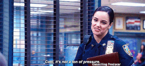 Amy Santiago from Brooklyn Nine-Nine delivers her iconic line, 'Cool, it's not a ton of pressure,' with a sarcastic smile.