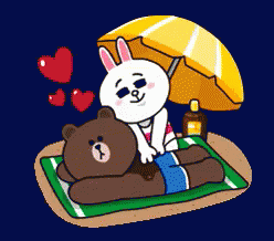 Brown and Cony from LINE Friends enjoying a relaxing beach massage under a yellow umbrella.