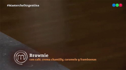 A delicious brownie dessert from Masterchef Argentina, topped with whipped cream, raspberries, and served with coffee and caramel.