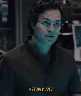 Bruce Banner, played by Mark Ruffalo, reacts with a concerned expression to '#TONY NO' in a dark room.