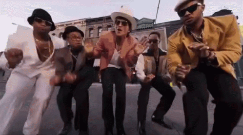 Bruno Mars and his crew dancing energetically on a city street, dressed in stylish outfits.