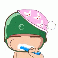 Cute cartoon character with a pink bunny hat brushing teeth.