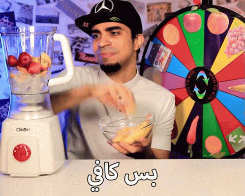A man prepares a fruit smoothie in a Clikori blender next to a colorful 'Spin to Win' wheel, with the caption 'That's enough'.