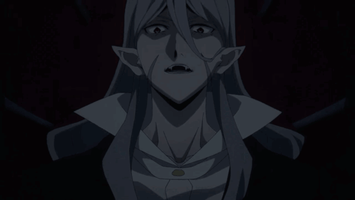 Bram Stoker, a character from Bungou Stray Dogs, with long white hair and fangs, looking surprised in a dark setting.
