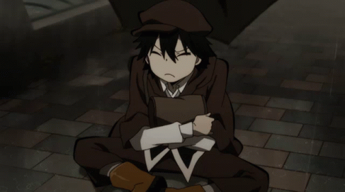Edogawa Ranpo from Bungo Stray Dogs sits on the ground, yawning while holding a book.