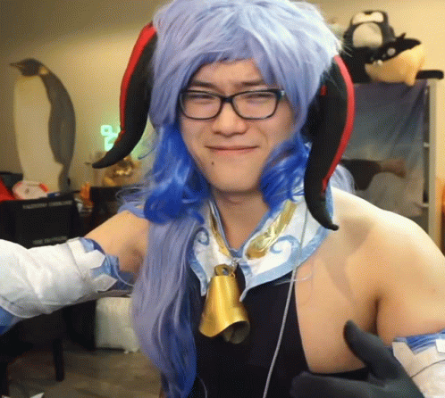 Btmc cosplaying as Ganyu from Genshin Impact, wearing a purple wig, horns, and glasses, smiling.