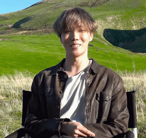J-Hope (BTS) smiling and clapping while sitting in a chair outdoors against a vibrant green, hilly landscape.