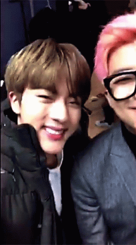 BTS members Jin and RM share a fun moment, smiling and making playful faces for the camera.